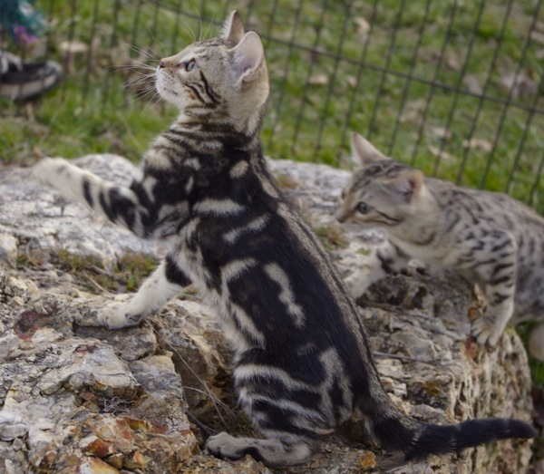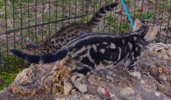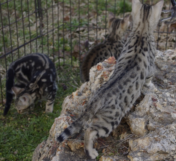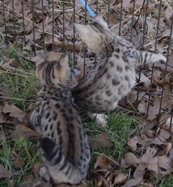 Below are the kittens at 11 wks. These pictures were taken at sundown so their colors are kind of greyed out. They were also still in their fuzzy stage, so patterns are not as clear as they are now and will be even clearer soon: