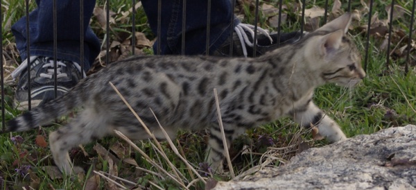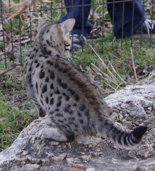 Below is the brown spotted/rosetted girl. These do not show her off very well. Still in her fuzzies, and these photo's were taken at dusk. Her pattern is already clearer than this. She has excellent type and a whited tummy. The tip of her tail was nipped off at birth...so shorter than it should be.
