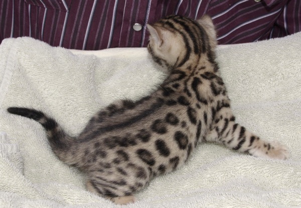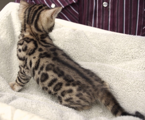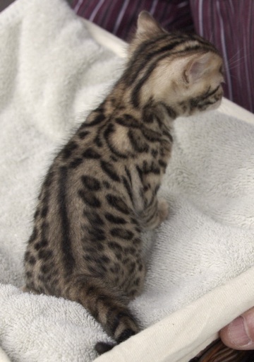 Born on February 24, 2012. One absolutely gorgeous Bengal girl. She is only 3 1/2 weeks old and is already very rosetted. This girl has no rib bars, and not a hint of a bullseye pattern. Both parents are richly colored so she will be too. While it is too early to tell type, with these parents it is almost a given. She is available, at this time, for $1,000 as a pet, $2,000 as a breeder/show prospect (approved breeding home only) but will continue to be evaluated.