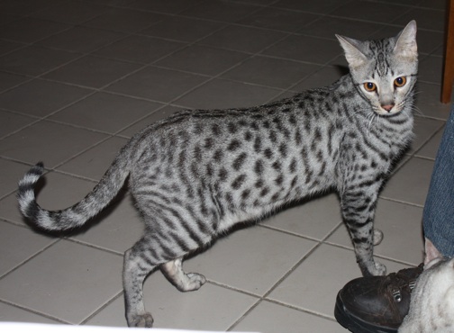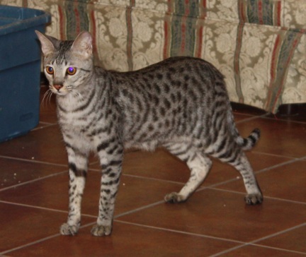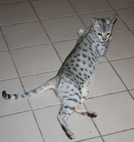 This boy is a very nice "servaly" silver F3B. He has classic "boomerang" shaped very dark amber eyes. He is outgoing and funny. He is already neutered and will make a wonderful, active pet. He is available for an adoption fee of $1,800.00.