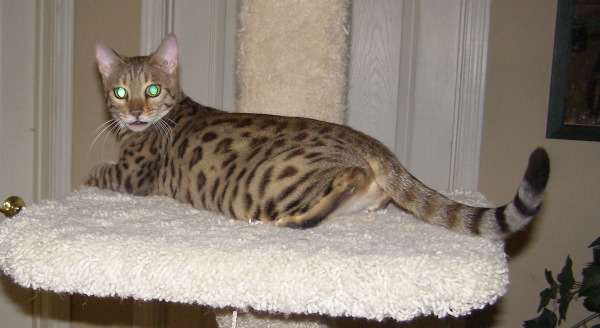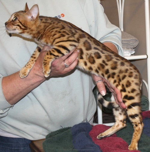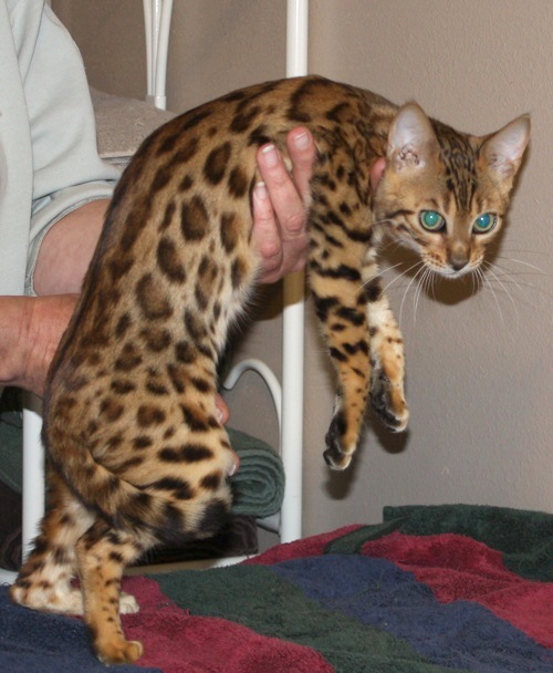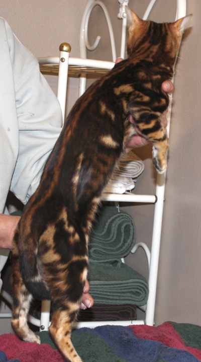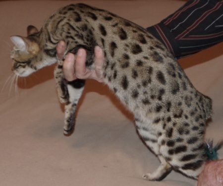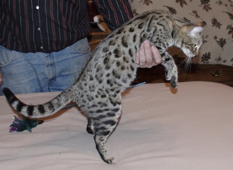 I just can't say enough about this little girl. She looks more like and F2 than an F7. BBJ has a winning personality and is just a joy to watch. She produced her first litter, and we couldn't be happier. Her kittens have incredible type. Can't wait to see what she produces in the future (probably my next show kitten :).