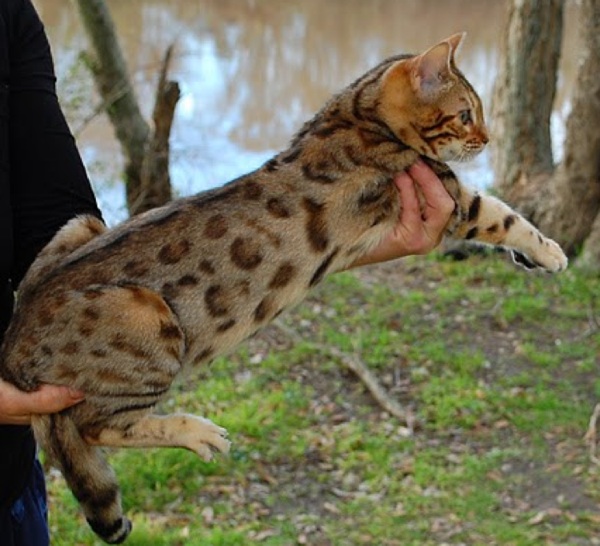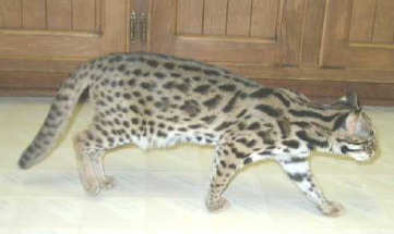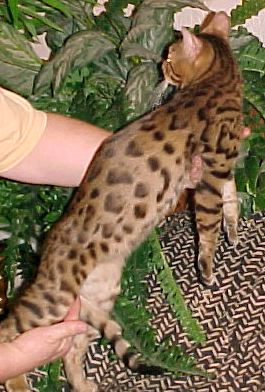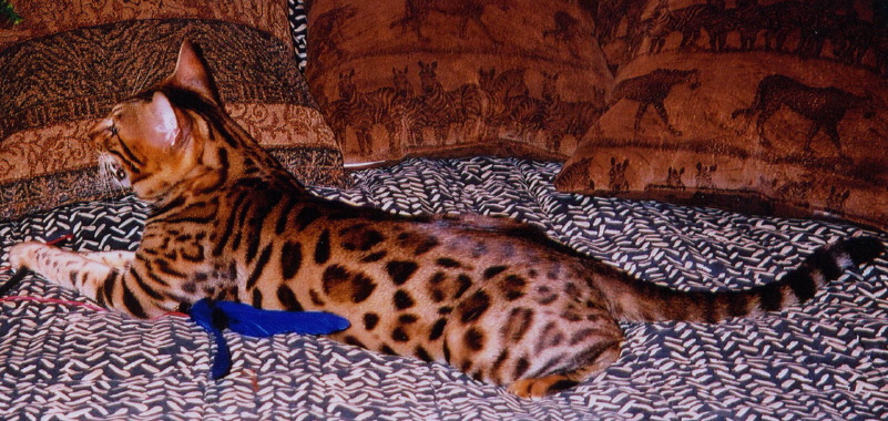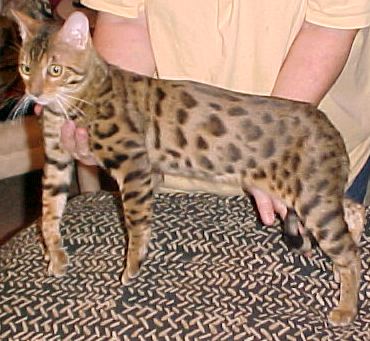 He has exceptional type, with wonderful small rounded ears, strong muzzle, excellent pattern with large random rosetted spots, clear short tight coat, highly glittered, superb personality. He is a TICA Quad Grand Champion in only 4 shows.